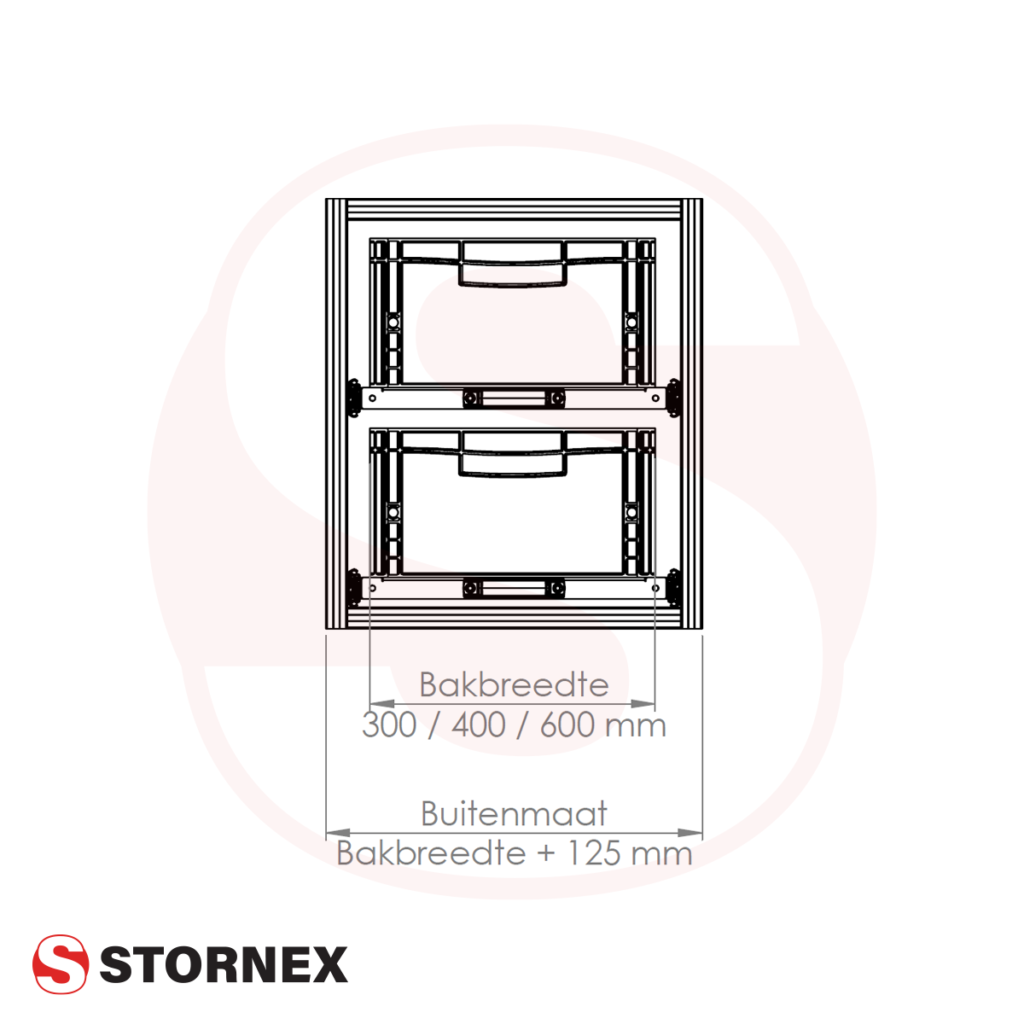 De modules zijn leverbaar in onderstaande bakbreedte afmetingen. Achter de afmeting van de bakbreedte staat de breedte vermeld voor de totale buitenmaat.