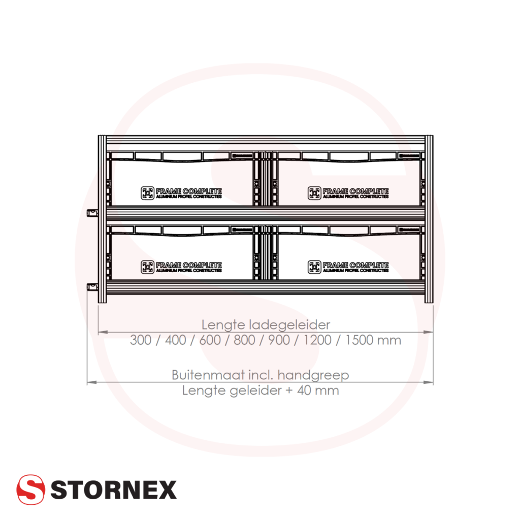 De module is leverbaar in de onderstaande lengte afmetingen. Dit is tevens de afmeting voor de ladegeleider welke volledig uittrekbaar is. De afmeting welke vermeld staat achter de lengte afmeting is de afmeting inclusief de gele vergrendeling.