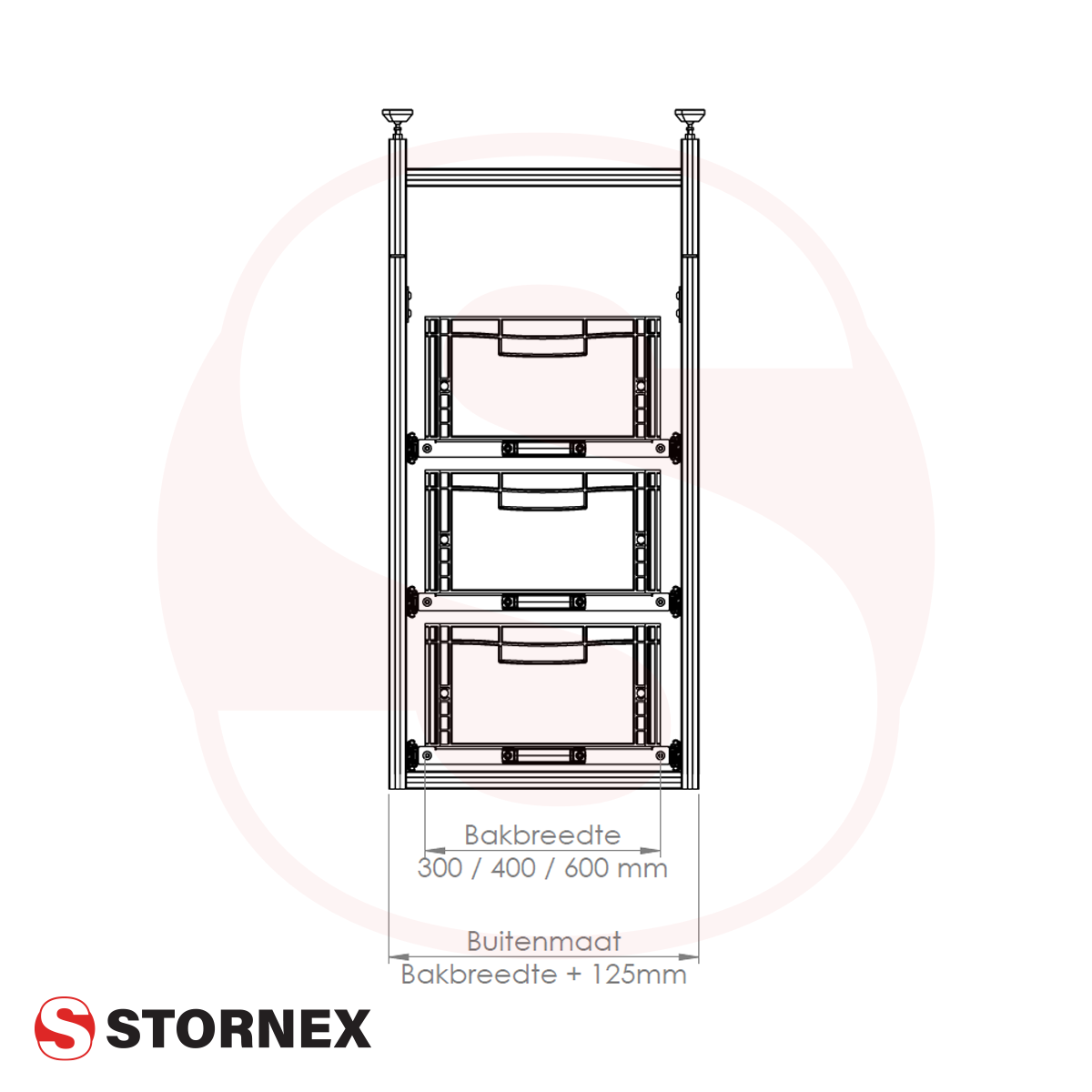 De modules zijn leverbaar in onderstaande bakbreedte afmetingen. Achter de afmeting van de bakbreedte staat de breedte vermeld voor de totale buitenmaat.