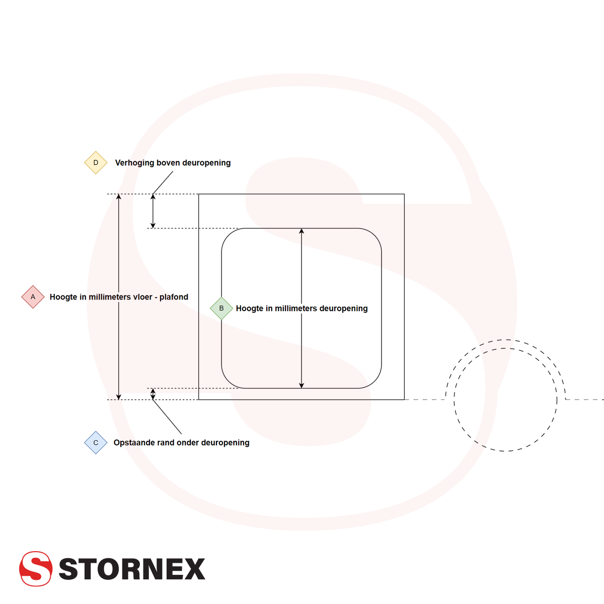 Het basisframe wordt buiten de camper opgebouwd en moet dus door de deuropening passen. Hierbij is afmeting B (Hoogte in millimeters deuropening) van belang. Voer de exacte afmeting in millimeters in, wij houden zelf rekening met een extra marge.
