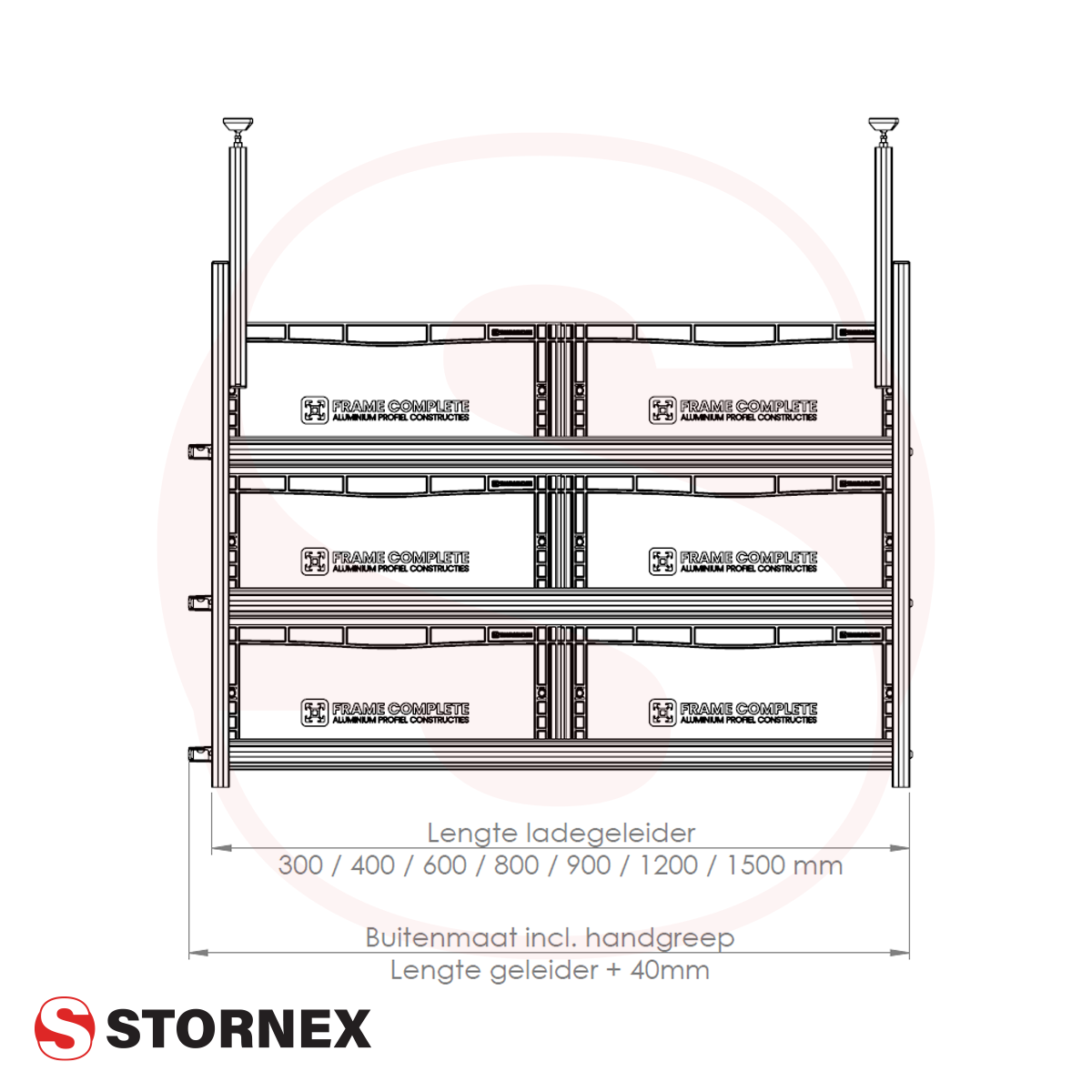 De module is leverbaar in de onderstaande lengte afmetingen. Dit is tevens de afmeting voor de ladegeleider welke volledig uittrekbaar is. De afmeting welke vermeld staat achter de lengte afmeting is de afmeting inclusief de gele vergrendeling.